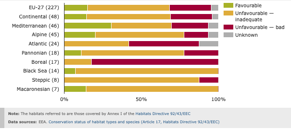 The development of human infrastructure, land-use change, excessive forest harvesting and forest fires in Europe has resulted in a landscape of fragmented forests.[14][15] This reduces the capacity of forest-dependent species to move to other forested areas and their ability to survive and adapt to climate change. Forests play an important role in the conservation of biological diversity. The area of protected forests in Europe increased by around half a million hectares annually between 2000 and 2010. Half of the protected forests are managed for conservation of biodiversity. In Europe, protected forest areas account for more than 45% of the Natura 2000 protected areas, 31.3% of the national designated protected areas, and about 12% of the total forest area. Despite the efforts to halt loss of biodiversity, 80% of forest habitat assessments still have unfavourable conservation status (see Figure 1).